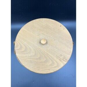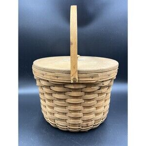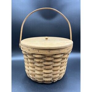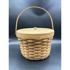 Medium size vintage Longaberger handled basket with an inverted bottom, lid, and plastic liner measuring 13" in diameter and 9" tall. There is some damage on the bottom as pictured, but the basket is in overall good shape for being 38 years old.