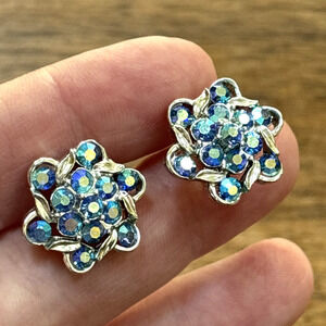 Vintage Longcraft Earrings Silver & Light Blue AB Rhinestones Round Screwbacks