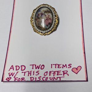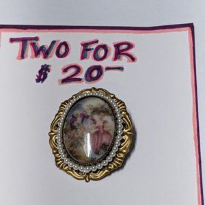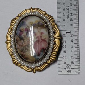 Very pretty, vintage looking pin, faux pearls with a sassy can can looking cameo girl with a suitor scene.