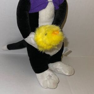 Adorable 13” Slyvester the cat plush with a bow tie and vest on holding a fluffy baby chick.