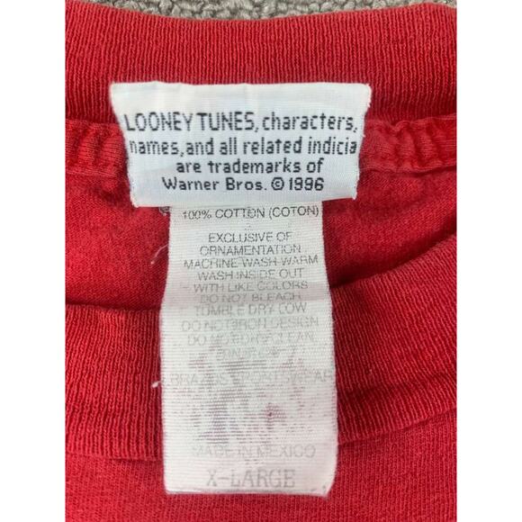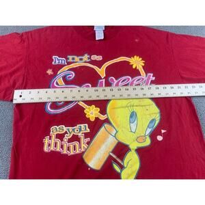 Bold red tee featuring Tweety with “I’m not as sweet as you think” attitude graphic (©1997 WB). Soft cotton, relaxed 90s fit—great Looney Tunes fan/nostalgia piece. This is a double stitch.
