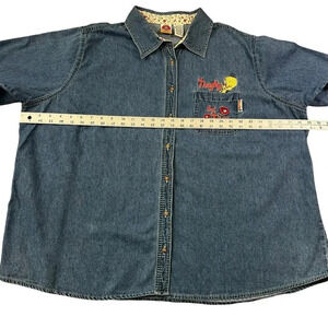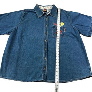 Get ready to show off your love for Looney Tunes with this vintage denim jean shirt featuring the iconic Tweety Bird. Made from 100% cotton fabric, this shirt is perfect for all occasions, whether it's for travel, casual wear, work, or business. The shirt has a collared neckline, short sleeves, and a button closure with an embroidered Tweety Bird accent. It also features a pocket and is available in a plus size of 26W/28W.