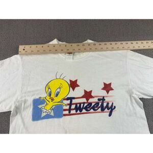 White tee with Tweety graphic and red stars over blue script logo; classic Looney Tunes neck tag. Soft cotton with vintage fit.