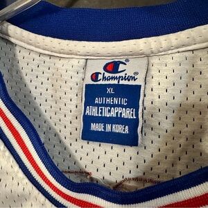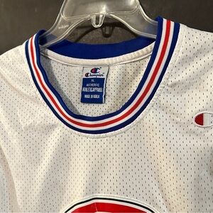 White basketball jersey with Tune Squad logo. Features red, blue, and white accents. Used good condition size men xl steamed before shipping.