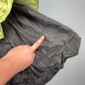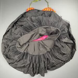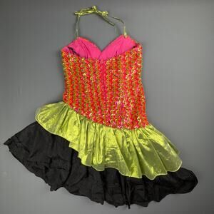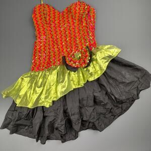 Vibrant vintage Loralie Original halter dress made in the USA. Features a hot pink and lime green sequin bodice with sweetheart neckline, metallic sheen ruffle, and full layered black skirt with tulle underlay. 70% acetate, 10% polyester, 20% metallic. Back zip closure with inner safety pin holding bow accent (not visible from exterior). Fully lined. Retro cabaret / showgirl style perfect for costume, dance, or collectible vintage fashion lovers. Excellent overall vintage condition with minor interior pin repair.
