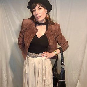 Step out in style with this fabulous Vintage Lord & Taylor Suede Cropped Jacket! A timeless piece that adds a touch of elegance and retro flair to any outfit. Perfect for those looking to make a fashion statement while appreciating the quality and design of bygone eras. Don't miss the chance to own this classic yet chic jacket, versatile enough to pair with dresses, high-waisted pants, or skirts for that perfect vintage vibe.