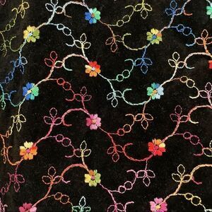 This beautiful vintage velvet blazer is in excellent condition. The velvet is embroidered all over with flowers in rainbow thread. There is no size tag but Approximate Measurements are below: