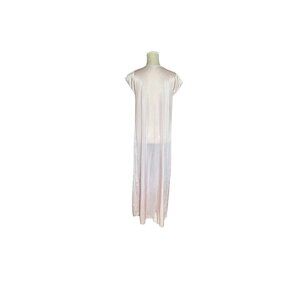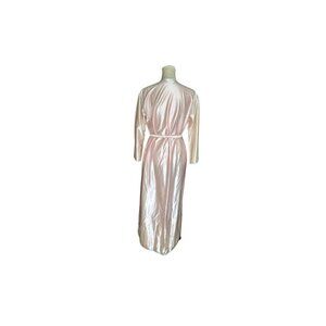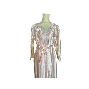 This stunning two-piece set includes a blush pink satin nightgown and a matching robe, embodying the elegance and charm of 1980s romantic boudoir wear. Perfect for luxurious lounging or a special occasion.