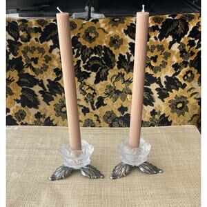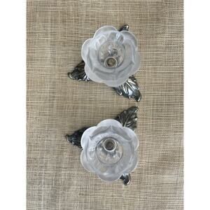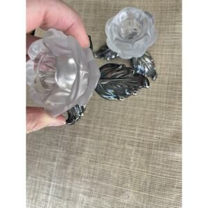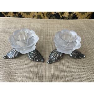 Vintage Lot Frosted Glass Rose Taper Candle Holders Signed PM Italy Silver Plate