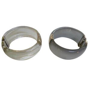 These vintage Lucite bracelets feature a retro moonglow design with a silvertone hinged clamper style. A stylish addition to any accessory collection, perfect for vintage fashion enthusiasts.
