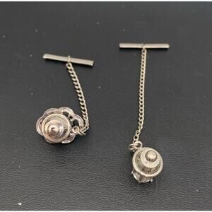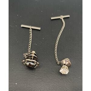 This product is a vintage lot of two silver tone tie tacks, one featuring a hematite stone and the other a clear rhinestone. These tie tacks are designed for men and showcase a classic silver color with a white/colorless main stone. Made with rhinestones, they add a touch of elegance and sophistication to any outfit. Perfect for adding a stylish accent to a formal ensemble or completing a vintage look, these tie tacks are a timeless and versatile accessory for any man's wardrobe.