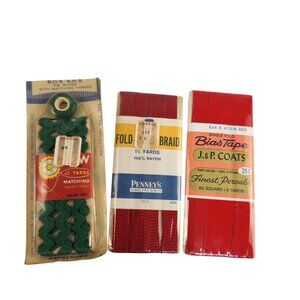 This assorted vintage sewing trim collection features a variety of styles and lengths, including Wrights Rick Rack, bias tape, folded braid, hem tape, and quilt binding. With a spectrum of colors and multiple decorative designs, this set is perfect for tailoring projects, crafts, or adding a stylish touch to garments. Many items are in their original packaging, ensuring high-quality New Old Stock (NOS) condition. Whether you are a sewing enthusiast or a collector of vintage notions, this collection adds unique character and charm to your creations. Ideal for upholstery, clothing embellishment, or creative DIY applications.