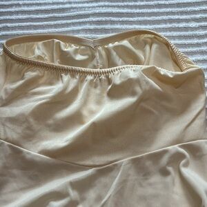 Ivory one is by Wonder Maid non clingy. It is strapless, Sz34; length 47” from top bodice to bottom of slip.