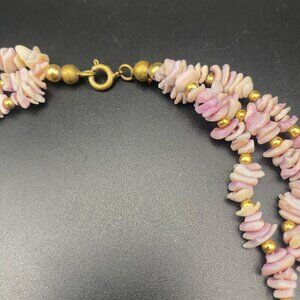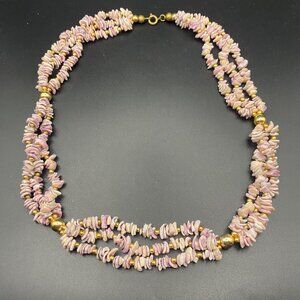 • Necklace 2: Triple-strand lilac and cream shell chip necklace with gold tone spacers and spring ring closure. Length 20"