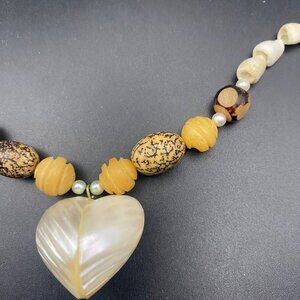 • Necklace 3: White shells, brown beads with carved shell heart pendant and barrel closure. Length 16"