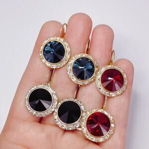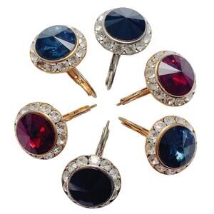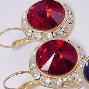 Wow! Fiery lot of three rivoli earring pairs from the mid-century: jewel-tone centers spin the light, ringed with clear chatons and set on secure lever-backs in gold tone and silver tone.