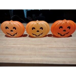 This is for a Vintage Lot of 3 Glow Lite Hanging Window Plug In Pumpkin Blow Molds In Boxes. These vintage pumpkins have been tested and are in good working condition. Please see all pics for the condition of all which is good showing some surface wear, and one of them is a little darker than the other two.