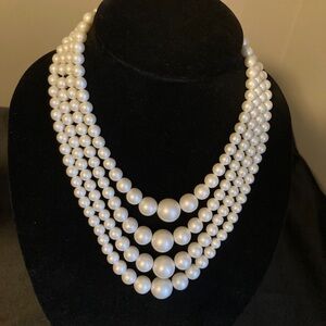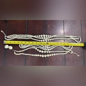 Beautiful vintage lot of 3 faux pearl necklaces, all stamped Japan, along with a pair of matching clip-on earrings also marked Japan. Each necklace features classic creamy white faux pearls with varying strand counts and bead sizes, perfect for vintage fashion lovers or collectors of mid-century costume jewelry.