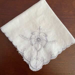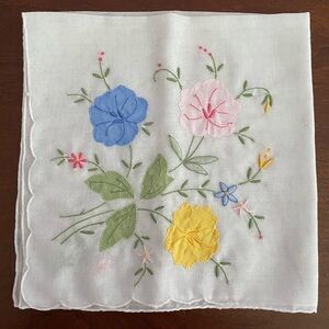 One white handkerchief with delicate pastel flowers and scalloped edge
