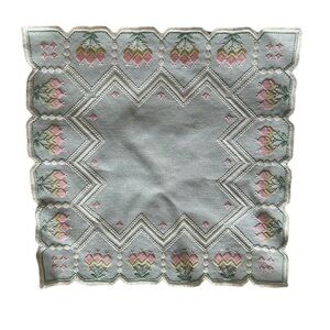 Excellent pre owned vintage condition. There is slight staining, mostly on the pink tulip embroidered table linen. (See picture)