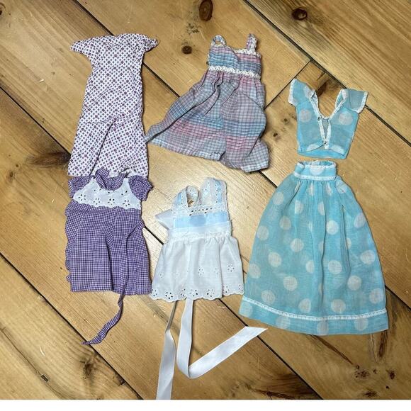 Vintage Lot of 6 Doll Clothes/Dresses. Purple/Blues/Dots. 12inch?