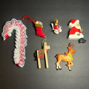 Vintage Lot of 6 Mixed Christmas Ornaments Ribbon Candy Cane, Bird, Santa & Deer