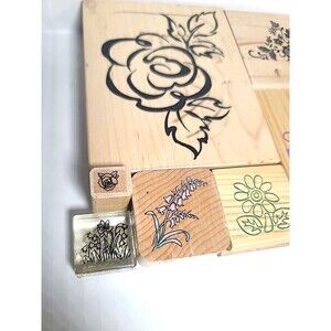 This lot of wooden rubber stamps features a beautiful array of flowers and plants, perfect for adding a touch of nature to your crafting projects. The set includes seven stamps, including a large rose stamp. Made from high-quality rubber, and wood these stamps are designed to last and create crisp, detailed impressions every time.