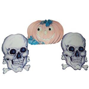 ☆ 5th picture - Two skull heads and pumpkin - one sided, all marked "Printed in USA"