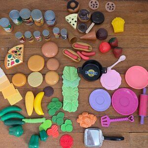 Vintage Lot of play food including burgers and toppings such as cheese, lettuce, and more, plus desserts from donuts to cookies, veggies like peppers and carrots, canned goods, a skillet, plates, and more.