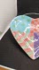 This is a Lotus 1998 Whimsical Heart Shaped Cookie Plate, a vintage ceramic serving dish with a colorful, multi-patterned design. The plate features four distinct sections: one with light blue background and green hearts, one with orange and pink checkered pattern, one with green and red wavy lines, and one with purple background and yellow dots. It is approximately 9.5 inches long, 10 inches wide, and 1 inch deep. This plate is marked LOTUS 1998 on the back. There is 1 teeny flake on the front of the plate (see last pic) .