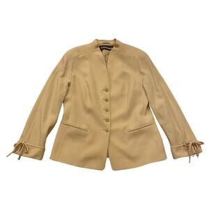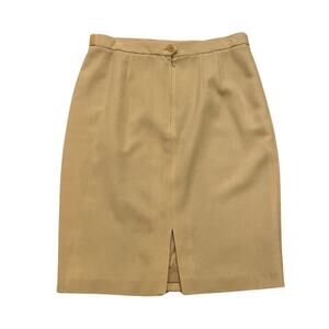 Beautiful vintage Louis Féraud blazer and skirt suit in a rich golden camel hue. This timeless European designer set is crafted from a luxe virgin wool blend with slight stretch. Features include a structured mandarin collar blazer with gold logo buttons and a matching high-waisted skirt. This premium European set is crafted from a soft virgin wool blend with slight stretch and elegant tailoring. The jacket features a chic mandarin collar, gold logo buttons, princess seams, and wrist ties. Skirt includes a modest back vent and has been professionally altered for extra room in the waist and hips — ideal for a curvier size 12 fit.