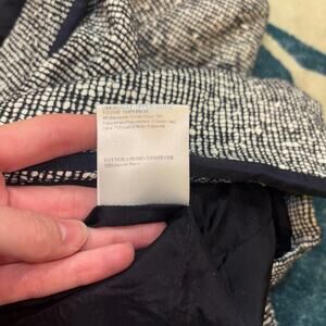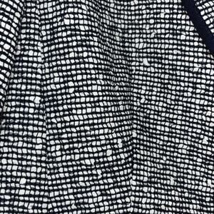 Color & Fabric: Elegant navy blue-and-white tweed featuring a cotton-wool blend (48% Cotton, 34% Polyurethane, 11% Wool, 7% Polyamide) with a trim-accented notched lapel and single-button closure, fully lined in 100% viscose.