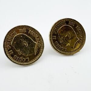 vintage earrings, Monaco coin earrings, Prince Louis II, gold tone earrings, screw back earrings, antique jewelry, statement earrings, collectible jewelry, French coin jewelry, vintage fashion accessories, historical jewelry