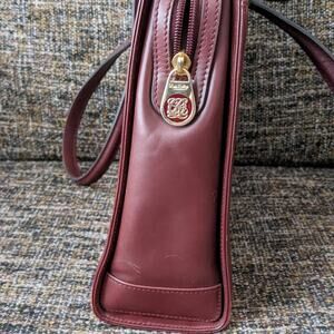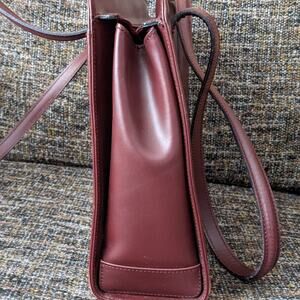 Good used condition maroon Louis Quatorze purse with gold hardware- perfect for a small laptop. There are a couple scratches on the leather but in great condition otherwise. See photos.