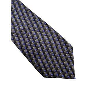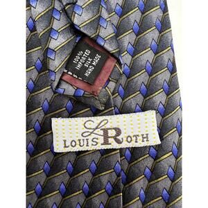 Art Deco inspired vintage Louis Roth blue and olive green geometric silk necktie. The tie's pattern has olive green, dark grey and blue diamonds in a print that is a subtle take on Art Deco tiling. This is a wide tie at 4" with no flaws to note. Cleaned and stored in a smoke free home.