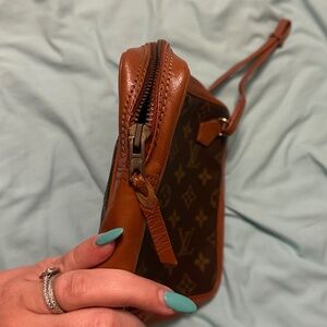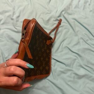 Beautiful vintage Louis Vuitton Monogram bag repurposed as a wristlet-style pouch. Features classic LV monogram canvas and vachetta leather trim. A great option for travel, events, or everyday use when you want a designer look without the bulk.