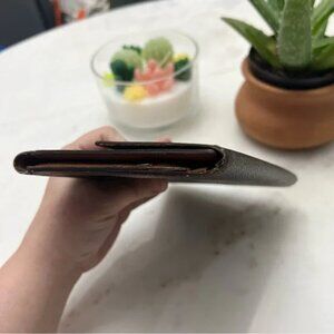 Please note, it is missing the zipper slider pull, but the slider remains functional, and a tiny hole can be used for a makeshift pull. There are minor signs of wear, including slight rubbing on the piping and light dark spots in the interior, but overall, it remains in great condition. The snap has been tightened, though it may need attention again, and the coin pocket shows some stains but is still usable.