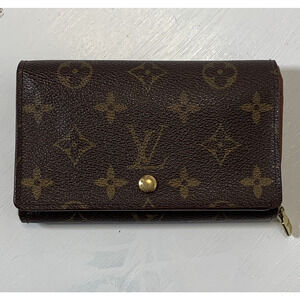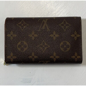 This vintage Louis Vuitton Porte Monnaie Billets Tresor Wallet in brown monogram design is a must have for collectors. The bi-fold snap close style includes an LV dust bag and storage box. Unisex.