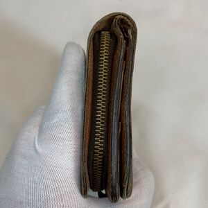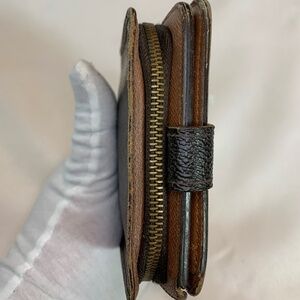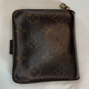 Vintage Louis Vuitton Small Wallet with Iconic Monogram in Classic Browns! LV is stamped on the zipper pull. The zippered section is accordion style and divided in two (2) areas for coins. The front has a snap closure and opens up to 5 Card Slots and 1 Pocket for Cash. This wallet has several call outs. Please see all the pictures as they are part of the description and they document the call outs. This item is sold As Is.