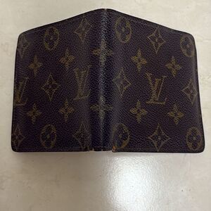 Please look at the pictures. This is a nice LV wallet but as you see, it is in vintage condition. Needs either reconditioning or Restaining inside and has cracks in the fold.