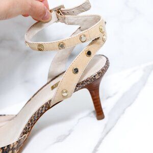 Nude/brown/cream color snakeskin with wrap around buckle closure featuring gold studs.