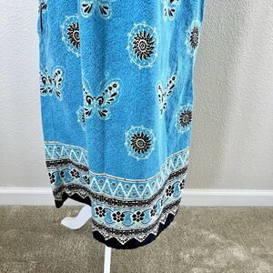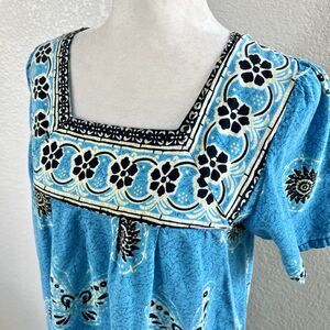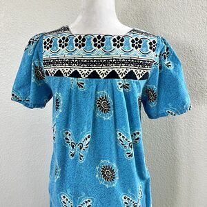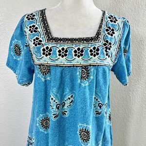 This vintage Loungees dress is a stunning addition to any wardrobe. The blue butterfly design on the 100% cotton fabric adds a classic and retro vibe, making it perfect for travel or casual occasions. The dress features a crew neck, short sleeves, and a pullover closure.