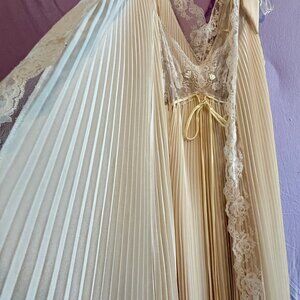1960s Lucie Ann Pleated Peignoir Set is new with tags. This timeless piece is a rare find. It's in excellent condition. Peignoir/Robe Set, Nightgown is Sheer Chiffon with Pleats, Robe is sheer chiffon. An elegant cream, this gown and robe set is size petite.