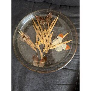 This vintage lucite plate features delicate dried butterflies and wheat accents encased in clear resin. Ideal as a decorative piece for a unique, natural aesthetic.