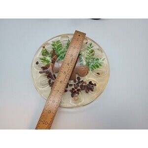 This vintage deviled egg plate is a must-have for any collectors of retro kitchenware. The round plate is made of clear acrylic with a unique design featuring coffee beans, baskets, and ferns. The plate can hold up to 10 deviled eggs and is perfect for entertaining guests.