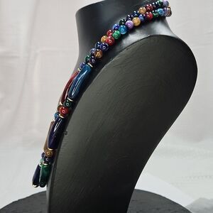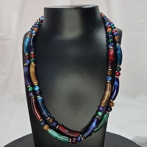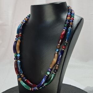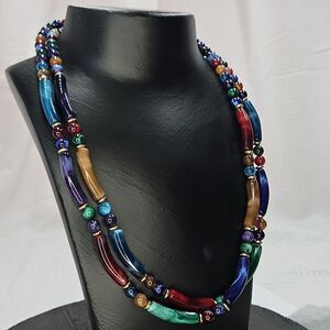 Two strands of rich, marblized jewel tone macaroni and round beads make up this gorgeous, lucite necklace.