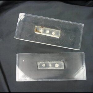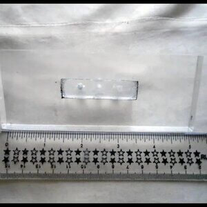 I had a rather large set of these and used what I needed to restore a vanity. These 2 are left. Heavy, clear Lucite lets you see a bit of discoloration on the attachment in the back. What was done to cover that on the ones that were used: that part of the backs was painted black, pushing the MCM look of these already Modernistic pieces. Ruler set to show size. 3 screw holes on attachment. 40s to 60s vintage