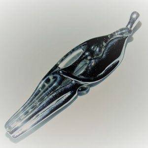 Silver toned metal and gray hued Lucite. The male figure is in silver, and the female figure is in a gray hued lucite. This is both a Brooch and Pendant.