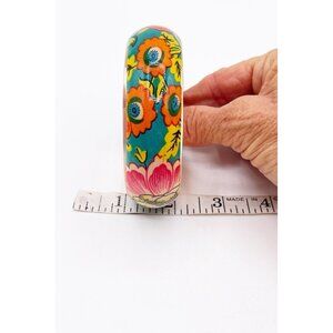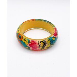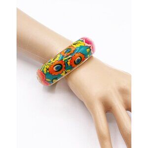 Vintage Lucite Fabric Over Wood 1” Wide Bangle Bracelet. Chunky Statement Floral Hippie Boho Retro. Good preowned vintage condition. Please see photos for details and measurements. Thanks for looking.
