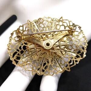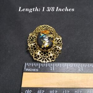 *Description: This is a beautiful filigree gold tone oval lace edged look with oval Lucite black cabochon with various shades of gold foil inside. It is a beautiful brooch and very delicate looking with the lacy filigree gold tone and beautiful Lucite foil center. This would be a great addition to your vintage jewelry collection or make a great vintage gift!